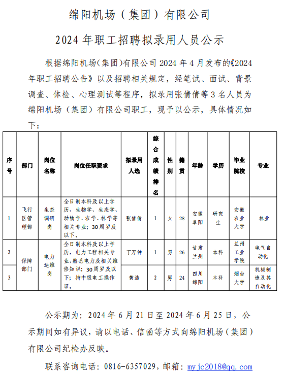 綿陽機場(集團(tuán))有限公司 2024 年職工招聘擬錄用人員公示